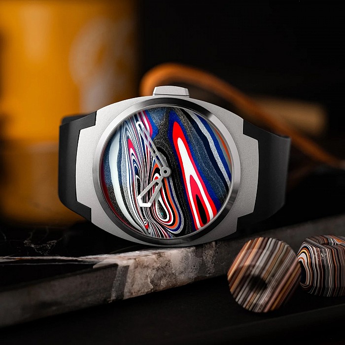 Arcanaut nabízí tři typy ciferníků z forditu. U tohoto modelu vidíte variantu „Groovy“, která odhaluje jedinečné barevné vzory vzniklé průřezem vrstvami laku.