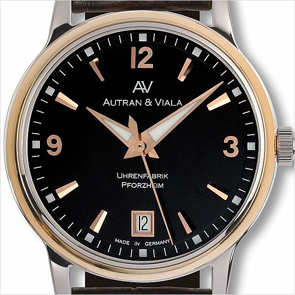 Dámské společenské hodinky v provedení bicolor. Elegantní černý ciferník zdobí plastické indexy, ručky mají luminiscenční výplň. Kožený řemínek.