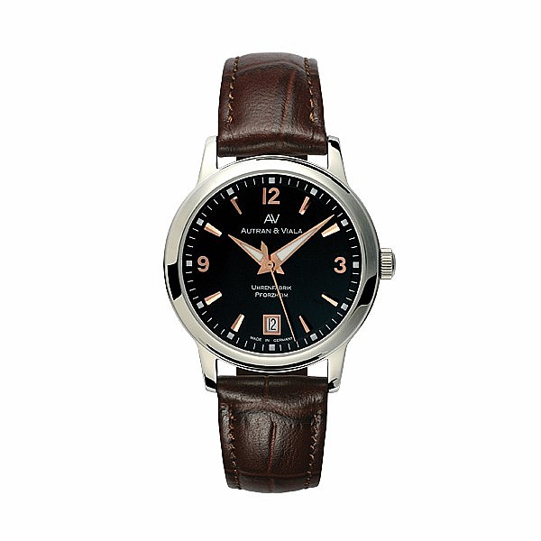 Dámské společenské hodinky z nerezové oceli. Elegantní černý ciferník zdobí plastické indexy, ručky mají luminiscenční výplň. Kožený řemínek.