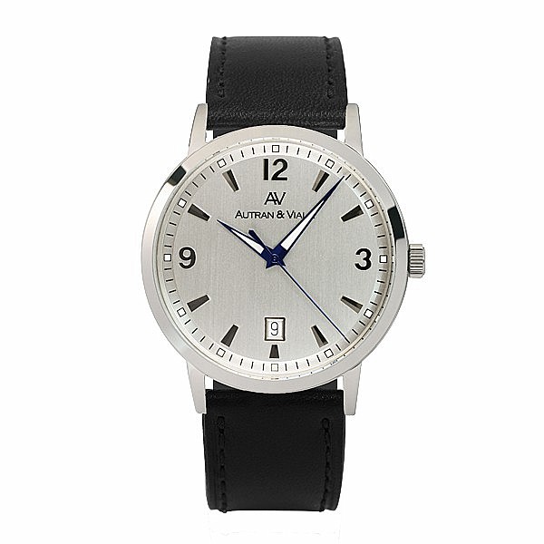 Pánské společenské hodinky s nerezovým pouzdrem na koženém řemeni. Modřené ručky, které jsou opatřeny luminiscenční barvou, kontrastují na stříbrném číselníku. Datové okénko na pozici 6.