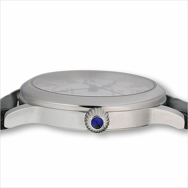Dámské společenské hodinky, ciferník s osmi broušenými zirkony. Korunka osazena modrým kabošonem.