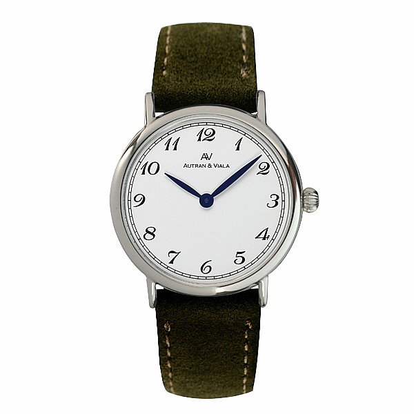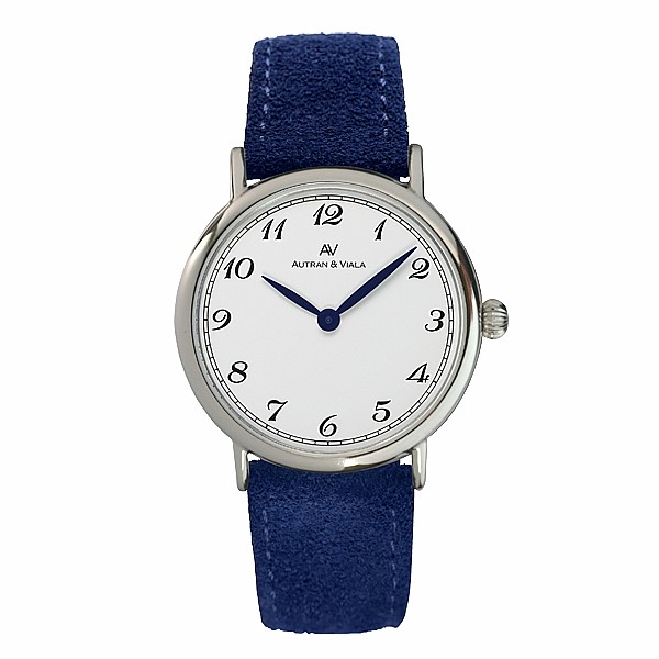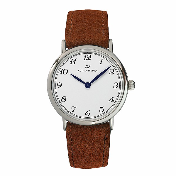 Jednoduché dámské hodinky z nerezové oceli s bílým číselníkem a modřenými ručkami. Kožený řemínek.