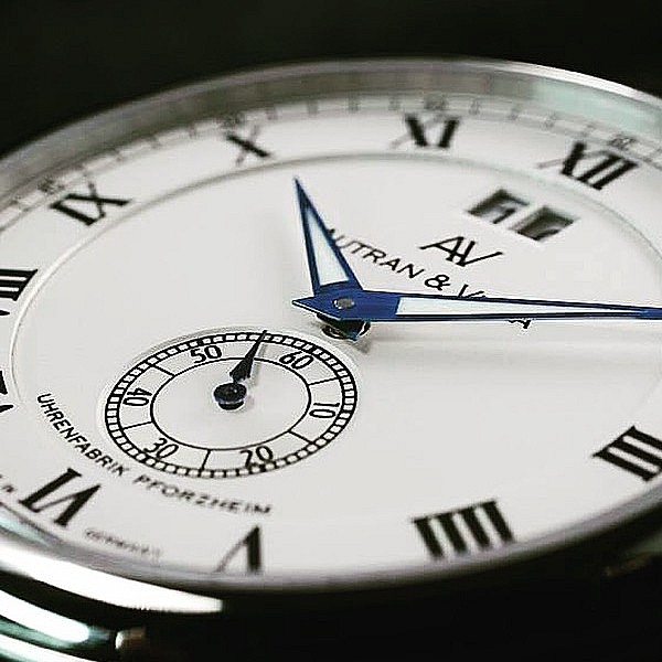 Společenské hodinky, zdobnější ale sofistikovaný vzhled. Zobrazení vteřin na subciferníku, velká datumovka.