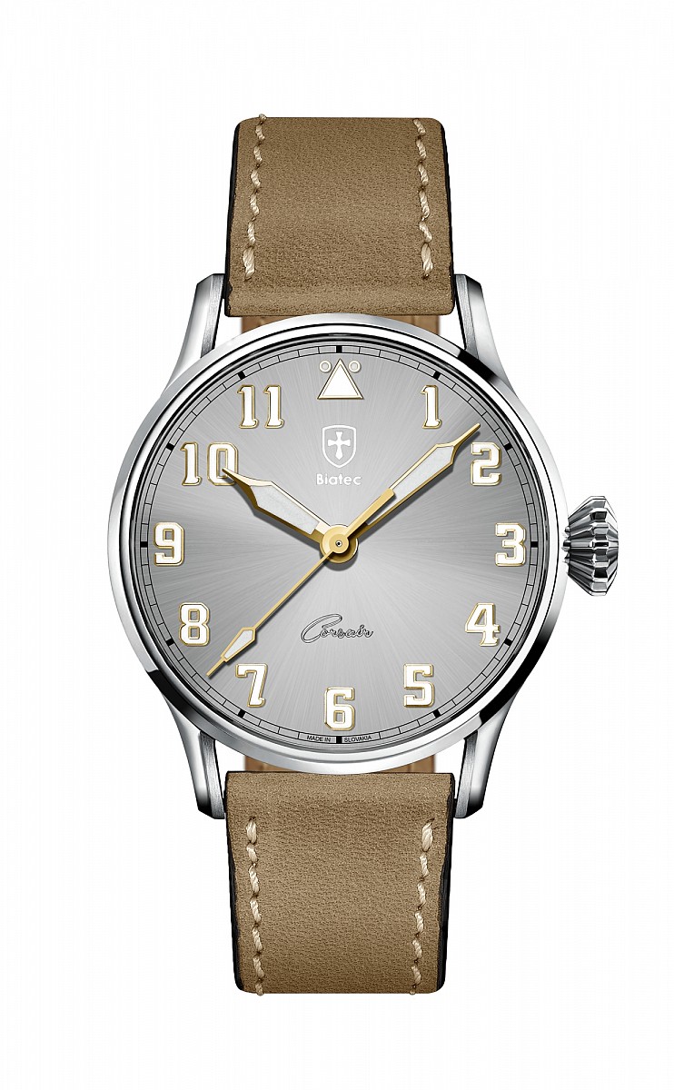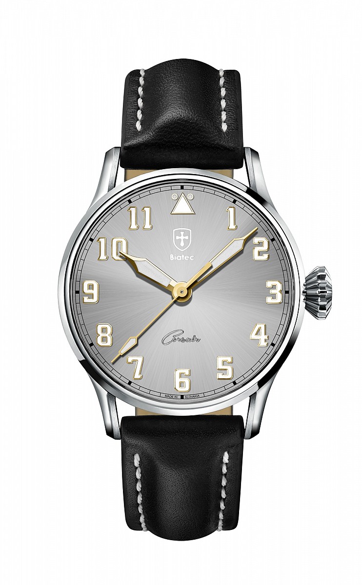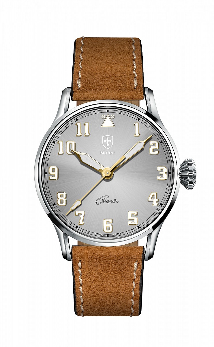 Biatec Corsair CS jsou špičkové moderní hodinky, jejichž design ovšem úspěšně evokuje slavné kapitoly letecké historie. Varianta 03 z modelové řady Corsair CS se vyznačuje stříbrným číselníkem s efektem centrálního brusu, zlacenými plastickými indexy vyplněnými luminisceční barvou a výraznými zlacenými ručkami rovněž se svítící výplní. Safírové sklo s antireflexní úpravou je samozřejmostí. Pilotní design umocňuje výrazná, tzv. diamantová korunka, jež je pro zajištění vodotěsnosti (10ATM) šroubovací. Hodinky jsou poháněny vynikajícím švýcarským strojkem Eterna 3902A, jenž se vyznačuje rezervou nátahu 65 hodin. Pro tuto variantu strojku je typické centrální umístění vteřinové ručky. Pouzdro o průměru 40 mm je vyrobeno z nerezové oceli 316L. Pouzdro je osazeno dýnkme s průhledem, kterým lze pozorovat strojek s rotorem, jenž je doplněn miniaturou vrtule slavné americké stíhačky Vought F4U Corsair.