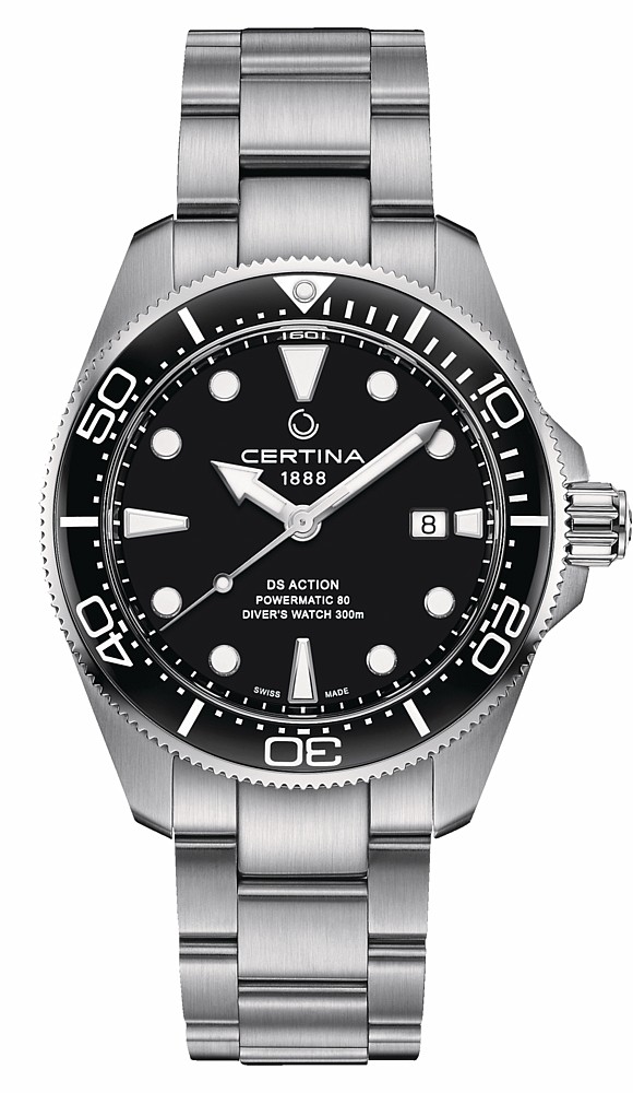 DS Action C032.607 jsou sportovní potápěčské hodinky s automatickým strojkem ETA powermatic. Ocelové pouzdro o průměru 43 mm má šroubovací korunku, jednosměrně otočnou potápěčskou lunetu a voděodolnost 30 ATM (300 m). Sklíčko je safírové s antireflexní úpravou.
