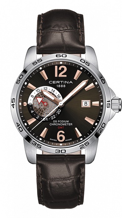 Certina DS Podium GMT jsou švýcarské hodinky s quartzovým strojkem s certifikací chronometru, ukazatelem druhé časové zóny a indikací končící životnosti baterie. Ocelové pouzdro má průměr 41mm, voděodolnost 10 ATM (100 m) a je vybaveno safírovým sklíčkem s antireflexní úpravou.