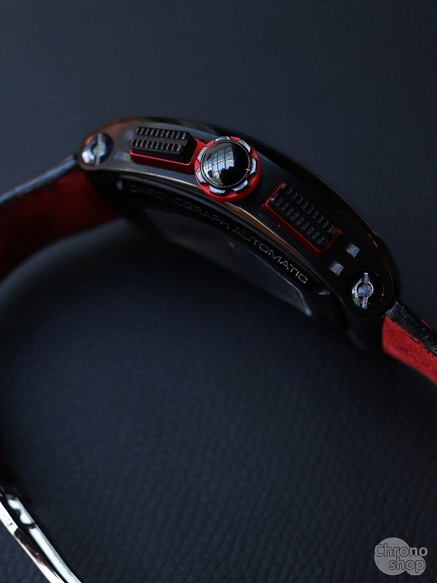 Dominantou hodinek je masivní soudkovité (tonneau) pouzdro z nerezové oceli s černou povrchovou úpravou. Opravdové vizuální divadlo se však odehrává pod safírovým sklíčkem. Ciferník je plně skeletonizovaný, což znamená, že máte neustálý a ničím nerušený výhled do samotného srdce hodinek – na komplexní soukolí švýcarského automatického chronografu, integrovaný datumový věnec a mechaniku stopek. Technický design inspirovaný motosportem zde fantasticky kontrastuje s luxusním řemínkem z aligátoří kůže, který modelu dodává patřičnou exkluzivitu.