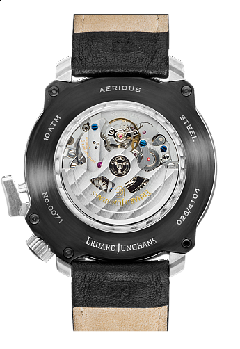 Erhard Junghans Aerious Chronoscope představují luxusní pánské pilotní hodinky. Nerezové pouzdro o průměru 46,6 mm má lunetu a dýnko opatřeno černou PVD vrstvou. Bezchybný chod hodinek je zajištěn mechanickým in-house kalibrem s automatickým nátahem J890 s funkcí zobrazení času, data, stopek a ukazatele rezervy nátahu. Strojek lze pozorovat safírovým průhledem v dýnku. Signovaná korunka je spolu s tlačítky chronografu úmístěna v pravé dolní části pouzdra. Matný černý číselník s luminiscenčními prvky je kryt safírovým sklem s antireflexní úpravou, která zaručuje perfektní čitelnost.