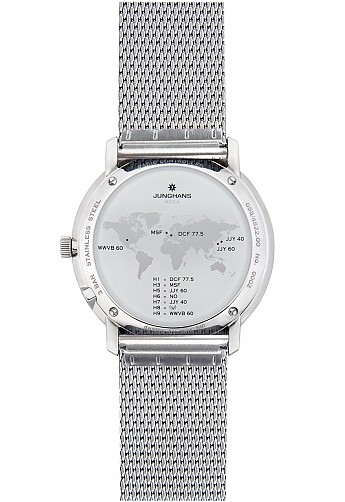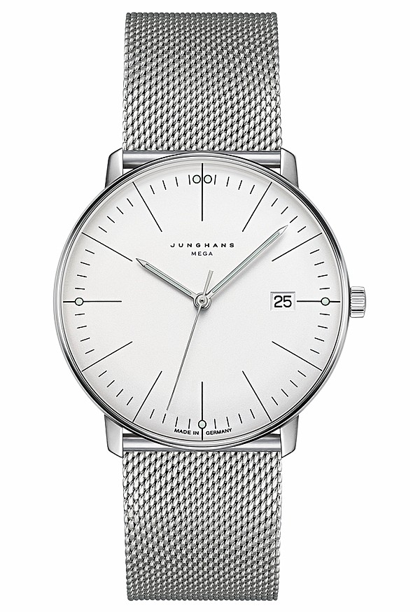 Junghans Max Bill MEGA je moderní reminiscence hodinek vyráběných firmou Junghans v 60. letech 20. století jako pocta slavnému švýcarskému architektovi Maxi Billovi. Tyto elegantní hodinky na milánském náramku jsou poháněny quartzovým strojkem J101.65. Jedná se o multi-frekvenční rádiem řízený quartzový strojek s funkcí zobrazení data. Synchronizace času funguje všude na světě díky rádiovým stanicím s dlouhovlnným časovým signálem DCF 77 (Evropa), WWVB (USA), JJY40 (Japonsko), JJY60 (Asie). Synchronizace času hodinek a vysílače probíhá jednou denně. Hodinky dosahují vysoké přesnosti i když se zrovna nacházíte mimo příjem signálu (-/+ 8 vteřin / rok). Seřízení času je možné také pomocí mobilního telefonu díky aplikaci Junghans MEGA App, která je dostupná pro Android a iOS. Tento strojek disponuje funkcí věčného kalendáře bez nutnosti korekce až do roku 2400, a to dokonce i bez příjmu rádiového signálu. Zajímavostí je, že vteřinová ručka vykoná dva skoky za vteřinu a minutová ručka se pohybuje skokově s každou minutou. Nerezové leštěné pouzdro má průměr 38 mm a výšku 10 mm. Matný stříbrný číselník je kryt konvexním plastovým sklem, které je opatřeno ochrannou vrstvou SICRALAN. Tato technologie zaručuje lepší odolnost proti poškrábání, proti působení UV záření a větší lesk sklíčka. Ručky mají luminiscenční nátěr. Hodinky jsou vlhkotěsné.