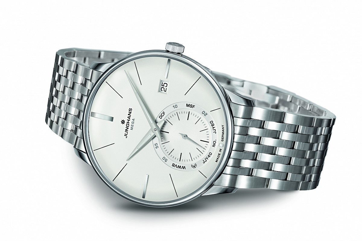 Junghans Meister Mega jsou společenské pánské hodinky na koženém řemenu. Pohon je zajištěn quartzovým strojkem J101.66. Jedná se o multi-frekvenční rádiem řízený quartzový strojek s funkcí zobrazení data. Synchronizace času funguje všude na světě díky rádiovým stanicím s dlouhovlnným časovým signálem DCF 77 (Evropa), WWVB (USA), JJY40 (Japonsko), JJY60 (Asie). Synchronizace času hodinek a vysílače probíhá jednou denně. Hodinky dosahují vysoké přesnosti i když se zrovna nacházíte mimo příjem signálu (-/+ 8 vteřin / rok). Seřízení času je možné také pomocí mobilního telefonu díky aplikaci Junghans MEGA App, která je dostupná pro Android a iOS. Tento strojek disponuje funkcí věčného kalendáře bez nutnosti korekce až do roku 2400, a to dokonce i bez příjmu rádiového signálu. Zajímavostí je, že vteřinová ručka vykoná dva skoky za vteřinu a minutová ručka se pohybuje skokově s každou minutou. Bílý číselník s ukazatelem data je kryt kovexním safírovým sklem. Ručky mají luminiscenční nátěr. Nerezové leštěné pouzdro má průměr 38,4 mm. Hodinky jsou vodotěsné do 5 ATM