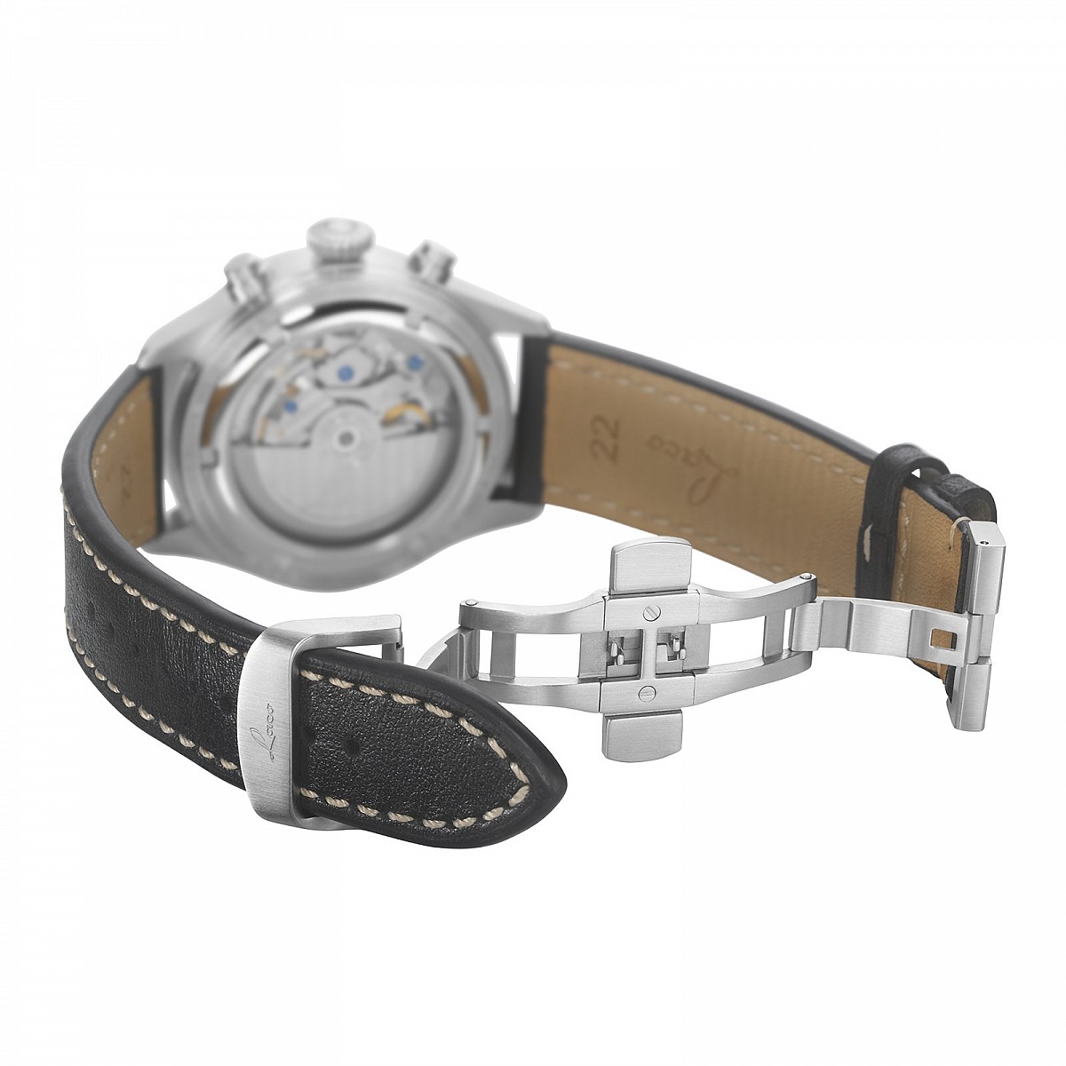 Díky motýlkové konstrukci tvoří hodinky s řemínkem i po rozepnutí spony uzavřený kruh. To znamená, že při nasazování nebo sundávání z ruky nehrozí náhodné vyklouznutí a pád hodinek na tvrdou zem. Spona je vyrobena z masivní ušlechtilé oceli s matnou povrchovou úpravou, která ideálně ladí s pískovanými nebo matně broušenými pouzdry (zejména u legendárních leteckých modelů Flieger). Pohodlné otevírání je řešeno pomocí dvou bočních tlačítek a na horní viditelné hraně nesmí chybět precizně vygravírované logo Laco.