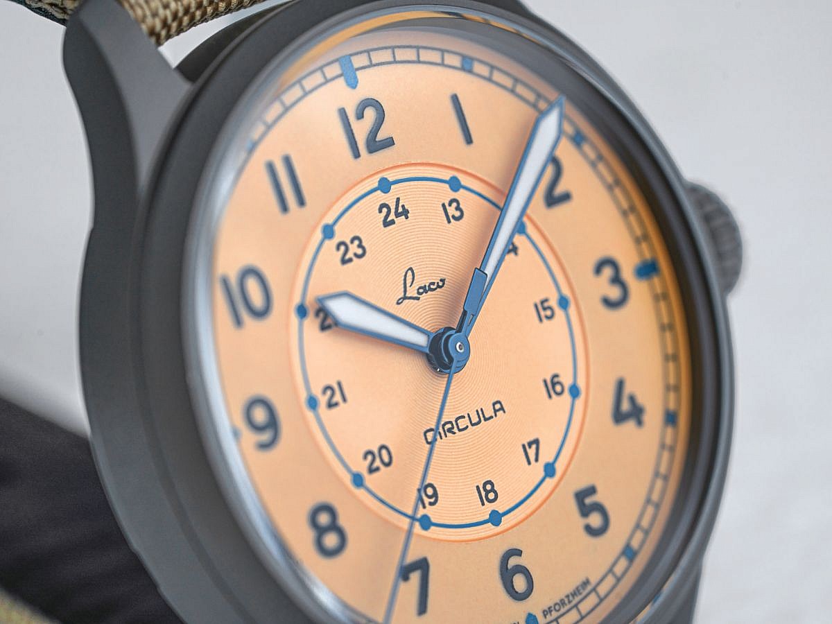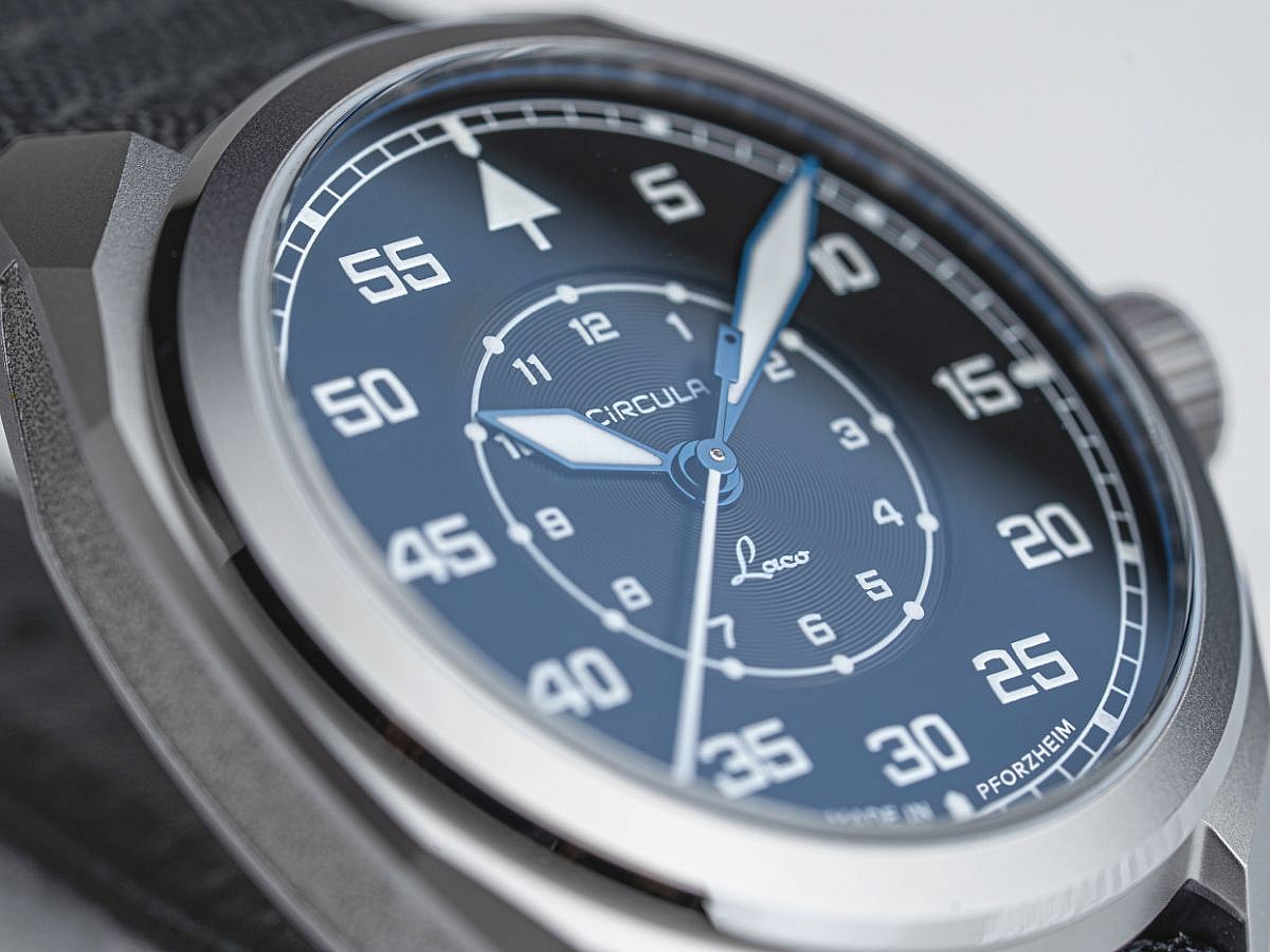 Číselník a Luminiscence: Sytě černý číselník s tradičním uspořádáním navigátorských hodinek: minuty na vnější stupnici, hodiny 1–12 uvnitř. Moderní výraz získává díky výrazné typografii Circula a jemné kruhové textuře ve středu.