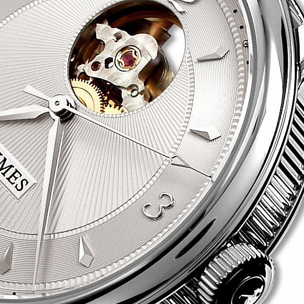 Klasické tříručkové hodinky se švýcarským automatickým strojkem ETA 2824 v provedení TOP. Stříbrný číselník v nerezovém pouzdře pod safírovým sklem vyniká svým plastickým zpracováním a jemným gilošováním. Průhled na pozici dvanáct odkrývá pohled na pohybující se setrvačku i s jejím rubínovým uložením.