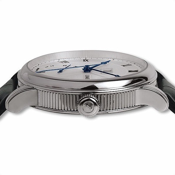 Stříbřený gilošovaný číselník s římskými číslicemi a modřenými ručkami, precizně zpracované pouzdro, velký ukazatel data a indikátor rezervy chodu jsou hlavními znaky těchto krásných společenských hodinek s automatickým nátahem. Strojek ETA 2892-2 TOP je zdoben ženevskými pruhy, perláží a modřenými šroubky.
