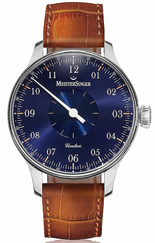 Modrá varianta unikátního modelu Circularis. Kontrast modrého číselníku s bílými indexy a charakteristickou jedinou ručkou zajišťuje velmi dobrou čitelnost a orientaci v čase. Zlatou barvou zvýrazněné hodinové indexy, tzv. sluneční brus sytě modrého číselníku a safírový průhed dýnkem na pětidenní manuální stroj se dvěma pérovníky pak ještě umocňují luxusní dojem z těchto vysoce elegantních hodinek.