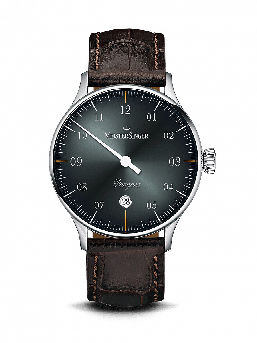 Pangaea Date jsou elegantní, neobyčejně tenké hodinky od MeisterSinger. Pangaea je také název superkontinentu, který na zemi existoval předtím, než se rozdělil na menší kontinenty. Dokonalé propojení všech částí hodinek dalo i tomuto modelu jeho jméno. S průměrem pouzdra 40mm je Pangaea decentním představitelem společenských hodinek a doplňuje nabídku MeisterSinger o dříve chybějící "ideální" rozměr. Samozřejmě si zachovává unikátní design ciferníku, nicméně pouzdro je zcela nové. Pangaea představuje eleganci a stylovost - na zápěstí se zdá být ještě jemnější, než by napovídala výška pouzdra 9,4 mm. Boky pouzdra plynule přecházejí v kvalitní řemen z teletiny. Harmonické spojení všech částí hodinek doplňuje dýnko s průhledem, dovolující pohled na strojek.