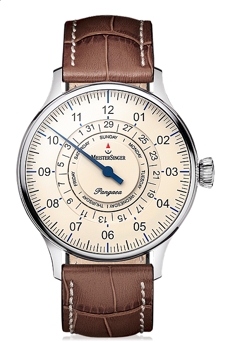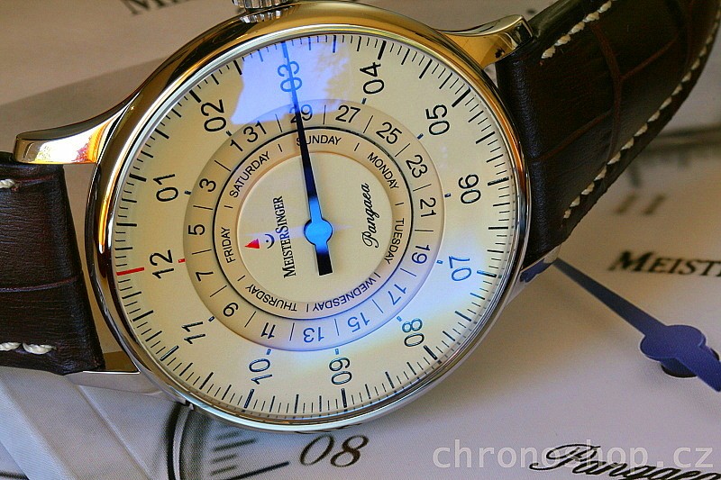 Pro lidi, kteří se potřebují orientovat v širším časovém rámci a kteří chtějí mít přehled o dnech uplynulých i nadcházejících, přichází MeisterSinger s novým modelem Pangaea Day Date. Dny v týdnu a data v měsíci jsou zobrazeny na dvou soustředných odkrytých datových věncích, které se stávají součástí jedinečného designu; aktuální údaje se pak odečítají oproti červené šipce na pozici 12.