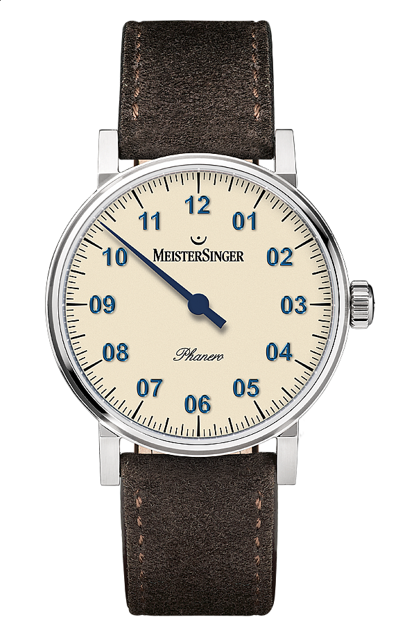 Tento nový jednoručkový model v kolekci MeisterSinger se vyznačuje nejmenší velikostí, je ale stvořen i pro ty největší příležitosti. Čas je zobrazován tradičně pomocí modré centrální ručky, díky které hodinky na první pohled zaujmou. Ciferník v barvě slonové kosti s modřenými číslicemi je chráněn klenutým safírovým sklem. Průhledným dýnkem je vidět švýcarský mechanický stroj Sellita SW 210 s rezervou nátahu 42 hodin.
