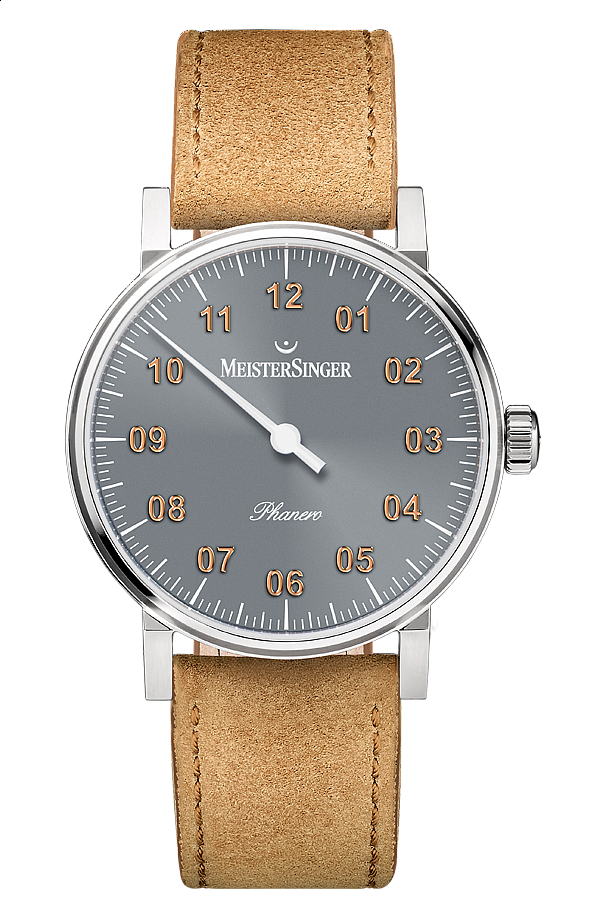 Model Phanero se v kolekci MeisterSinger vyznačuje nejmenší velikostí, je ale stvořen i pro ty největší příležitosti. Čas je zobrazován tradičně pomocí bíle centrální ručky, díky které hodinky na první pohled zaujmou. Antracitový ciferník se zlatými aplikovanými číslicemi je chráněn klenutým safírovým sklem. Průhledným dýnkem je vidět švýcarský mechanický kalibr Sellita SW 210 s rezervou nátahu 42 hodin.