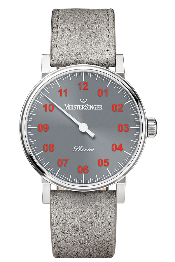 Model Phanero se v kolekci MeisterSinger vyznačuje nejmenší velikostí, je ale stvořen i pro ty největší příležitosti. Čas je zobrazován tradičně pomocí bíle centrální ručky, díky které hodinky na první pohled zaujmou. Antracitový ciferník s červenými aplikovanými číslicemi je chráněn klenutým safírovým sklem. Průhledným dýnkem je vidět švýcarský mechanický kalibr Sellita SW 210 s rezervou nátahu 42 hodin.