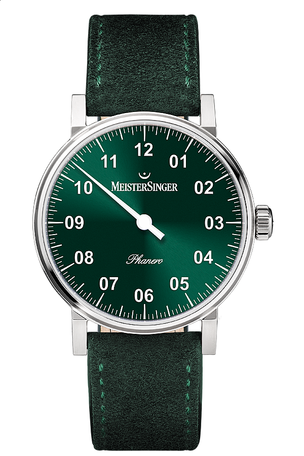 Model Phanero se v kolekci MeisterSinger vyznačuje nejmenší velikostí, je ale stvořen i pro ty největší příležitosti. Čas je zobrazován tradičně pomocí bíle centrální ručky, díky které hodinky na první pohled zaujmou. Originální zelený ciferník s efektem centrálního brusu a bílými číslicemi je chráněn klenutým safírovým sklem. Průhledným dýnkem můžeme pozorovat švýcarský manuální stroj Sellita SW 210 s rezervou nátahu 42 hodin.
