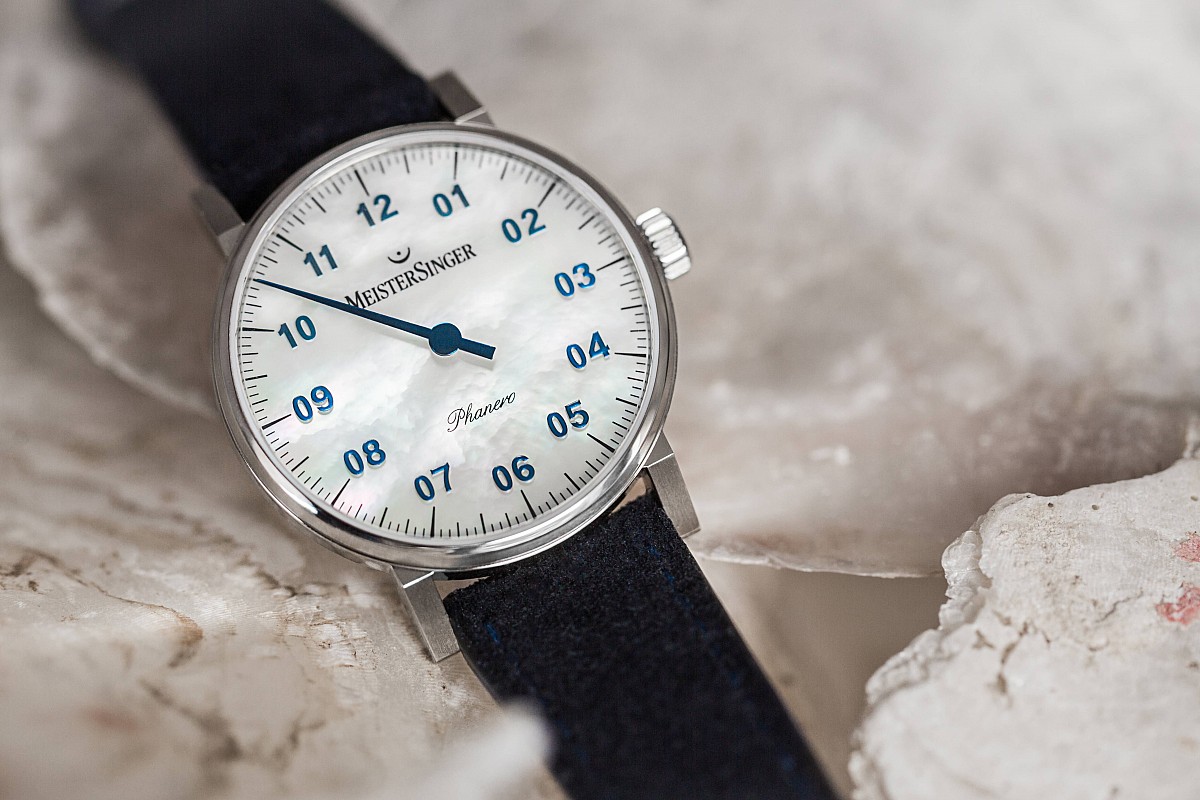Tento nový jednoručkový model v kolekci MeisterSinger se vyznačuje nejmenší velikostí, je ale stvořen i pro ty největší příležitosti. Čas je zobrazován tradičně pomocí modré centrální ručky, díky které hodinky na první pohled zaujmou. Perleťový číselník s modřenými číslicemi je chráněn klenutým safírovým sklem. Průhledným dýnkem je vidět švýcarský mechanický stroj Sellita SW 210 s rezervou nátahu 42 hodin.