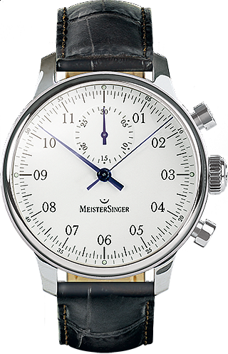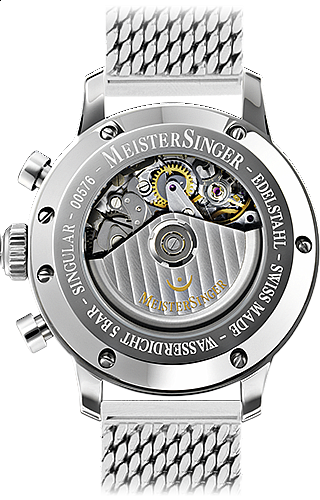 Singular – jméno modelu má základ v latinském slově singularis, znamenající ojedinělý, jedinečný. Tímto novým výtvorem MeisterSinger znovu vylepšuje svůj charakteristický rukopis, který spojuje nadčasové proporce a nový, moderní vzhled ciferníku. Hodiny používají velkou ručku k určování času, ale také další jemnou centrální sekundovou ručku a malou ručku na pozici 12, pro funkci stopek s třicetiminutovým čítačem. Unikátní chronograf, který vyjadřuje spíše klid a souměrnost, než dynamiku a rychlost jak bývá u stopek obvyklé.
