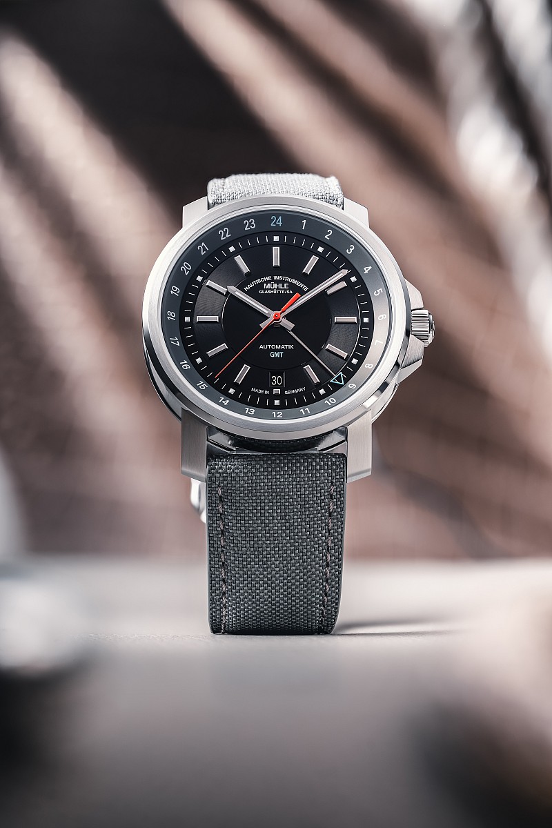 Největším překvapením je ale samotné pouzdro. Přestože si hodinky zachovávají robustní průměr 42,4 mm, podařilo se díky nasazení nového strojku srazit výšku pouzdra na neuvěřitelných 10,3 mm. Tyto GMT hodinky tak bez problému schováte i pod manžetu košile. Strojek SW 330-2 v úpravě Mühle nabídne rezervu chodu 56 hodin, nárazuvzdornou regulaci „datlí krk“ a speciální výroční rotor pro modely roku 2026. Samozřejmostí je bytelné zpracování se šroubovací korunkou chráněnou bočními kryty a vodotěsnost 10 bar.