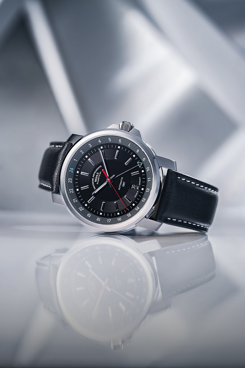 Barevné pojetí je mistrovskou ukázkou toho, že šedá barva rozhodně nemusí být nudná. Sytě černý hlavní ciferník lemuje šedý vnější prstenec (rehaut), na kterém se odečítá druhá časová zóna. Pro dokonalou orientaci je číslice 24 i šipka GMT ručky zvýrazněna světle modrou barvou. Čitelnost hlavního času zajišťují jasně bílé indexy a ručky s bohatým nánosem luminiscence Super-LumiNova. Pro lepší optické rozčlenění ciferníku jsou navíc aplikované indexy a okénko data umístěny mírně pod úrovní hlavní plochy.