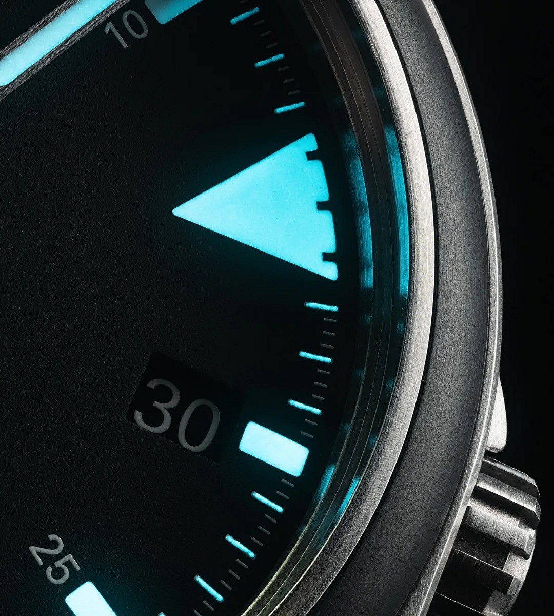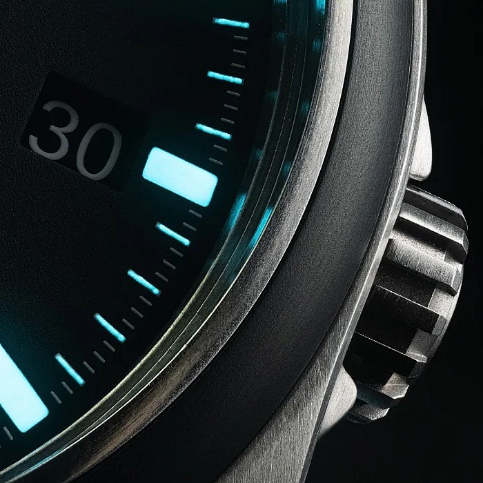 Oproti klasické ocelové verzi má Mission-Timer pouzdro vyrobené z hypoalergenního a lehkého titanu, což radikálně zvyšuje komfort při každodenním nošení. Průměr povyrostl na 43 mm, aby udělal místo pro širší a dokonale čitelný ciferník. Dalším velkým upgradem je obousměrně otočná luneta s vložkou z černé keramiky, která je prakticky nepoškrabatelná.