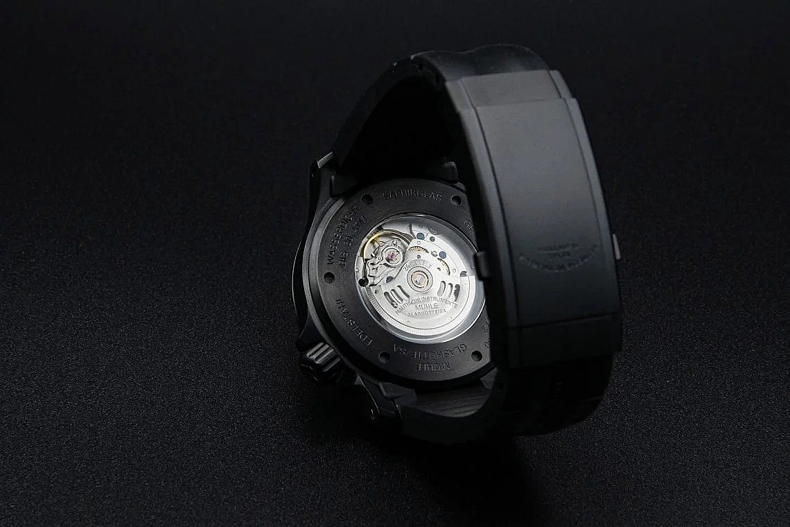 Pouzdro o průměru 44 mm je vyrobeno z ušlechtilé oceli, ale to hlavní se skrývá na povrchu. Je potaženo vrstvou TiC (karbid titanu) nanesenou metodou PVD. Výsledkem je temně černý, matný povrch, který je extrémně odolný proti poškrábání a nárazům. Perfektní čitelnost zajišťuje černý ciferník, z něhož ostře vystupují bílé indexy a luminiscenční ručky, chráněný 2,5mm antireflexním safírem.
