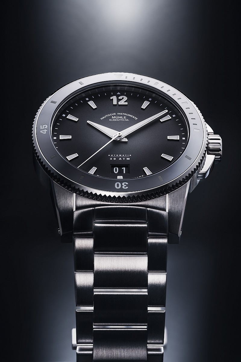 To, co dělá nové sportovní hodinky Mühle tak výjimečnými, je modulový strojek „MU9424-GD“ představený v roce 2024, který zajišťuje přesný čas a snadno čitelný velký datumový displej. Díky modulu navrženému přímo ve firmě lze velký datumový displej flexibilně umístit na straně ciferníku. To umožňuje jeho umístění na pozici 6 hodin, kde vyvažuje logo Mühle