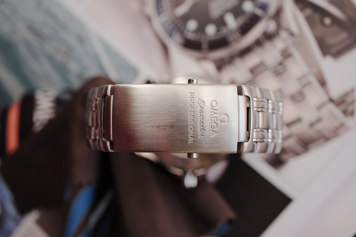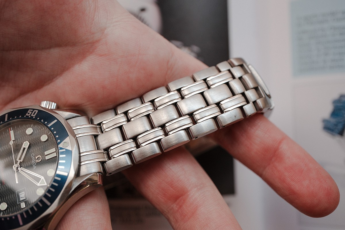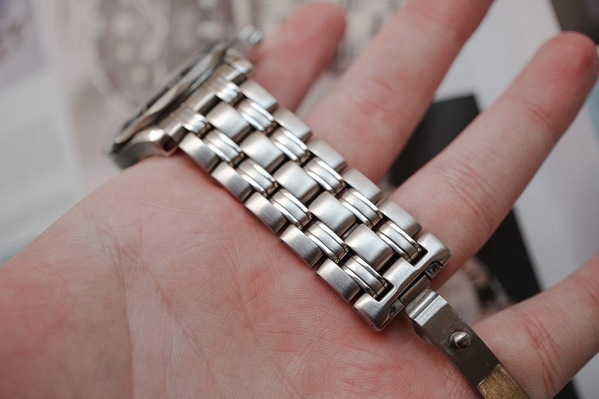 - Uchycení na zápěstí: Původní pětidílný ocelový náramek s potápěčskou extenzí.