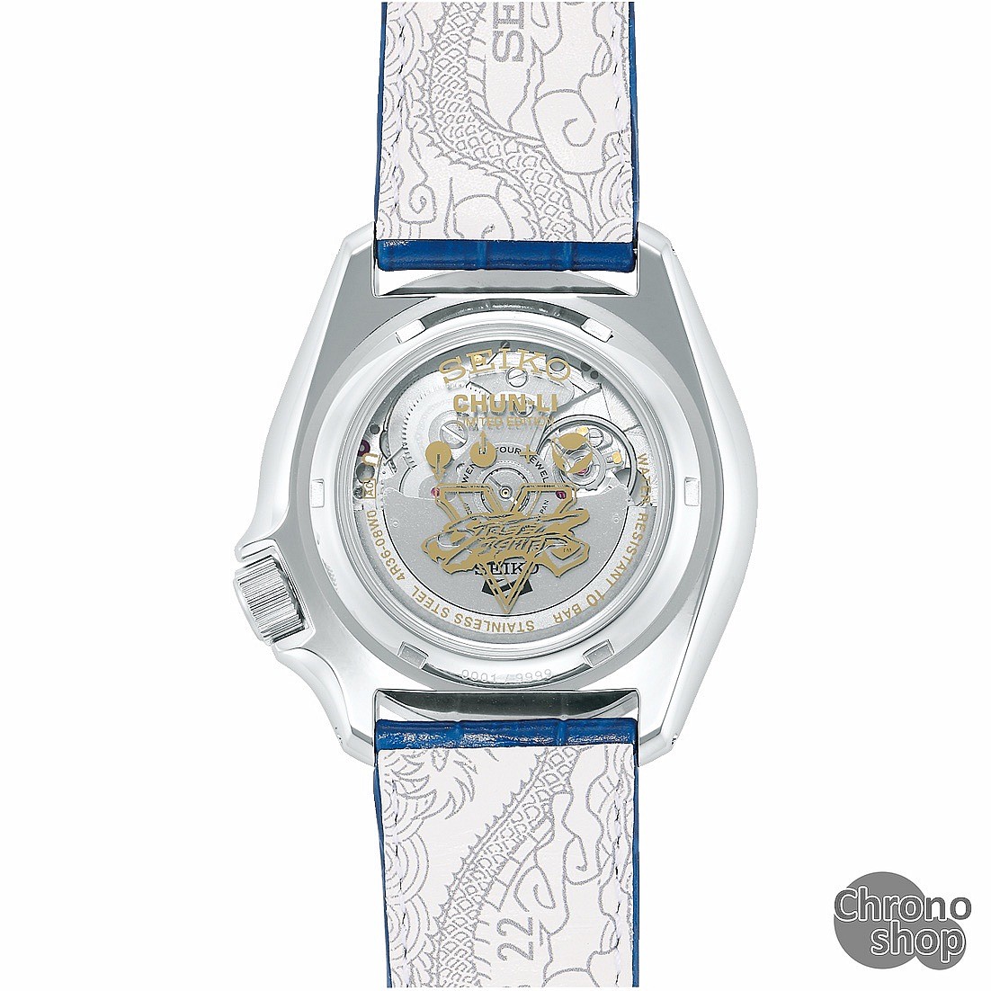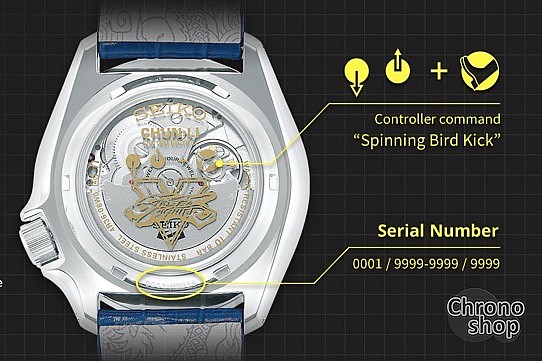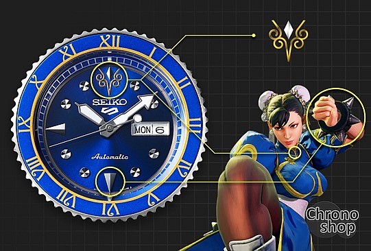 Seiko 5 Sports Street Fighter Limited Edition SRPF17K1 CHUN-LI Model jsou hodinky inspirované postavou policistky Interpolu CHUN-LI z počítačové hry Street Fighter V. Kombinace modré a zlaté barvy číselníku a lunety odpovídá šatům CHUNG-LI, index na dvanácté hodině pak znázorňuje její brož. Ostré indexy na šesté a deváté hodině jsou pak odkazem na její náramky. Dýnko s průhledem na mechanický strojek je zdobeno potiskem s logem Street Fighter a také kombinací pro speciální chvat CHUNG-LI. Teletinový řemen modré barvy je ze spodní strany potištěn dračím vzorem. Kromě svébytného designu jsou to především kvalitní dostupné mechanické hodinky japonského výrobce. Těchto hodinek je celosvětově vyrobeno 9999 kusů, číslo limitované série je uvedeno na víčku hodinek.