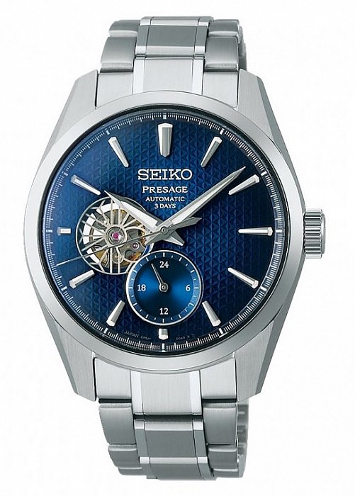 Hodinky Seiko Presage Sharp Edged Series, představené v roce 2020, si rychle získaly pověst hodinek s ostrou siluetou, výrazně vzorovaným číselníkem a ručkami s indexy, které odrážejí světlo a zároveň zvyšují čitelnost. Tato řada, která odhalovala silné vyjádření japonského umění a estetiky v kombinaci s nejmodernější mechanickou hodinářskou výrobou, demonstrovala rozsáhlé dovednosti a pokročilé výrobní techniky společnosti Seiko. Nyní se k řadě Sharp Edged přidává kromě nového designu také strojek 6R5J s rezervou chodu, která činí 3 dny při plném nátahu. Automatický strojek, o rychlosti 21 600 vibrací za hodinu, je vybaven indikací hodin, minut, sekund a vloženým číselníkem pro 24hodinovou indikaci na pozici 6 hodin. Poutavý výřez na pozici 9 hodin s charakteristickým vzorem asanoha neboli „konopný list“ nabízí pohled na setrvačku, která strojek reguluje. Na znamení vylepšené 72hodinové rezervy chodu je na číselníku každých hodinek uvedeno „Automatic 3 Days". Celá plocha kalibru 6R5J, včetně jeho zlatě zbarveného oscilačního závaží, je rovněž viditelná přes průhlednou zadní stranu pouzdra. Vylepšení se neomezují pouze na strojek. V řadě Sharp Edged se poprvé objevuje dvojitě zakřivené safírové sklíčko, které novým hodinkám dodává štíhlý vzhled na zápěstí. Díky novému sklíčku se číselník zdá být blíž a působí živějším dojmem, což zvyšuje čitelnost a celkovou atraktivitu číselníku. Tyto nové modely mají vylepšený design hodinových indexů a sekundové ručky. Indexy jsou ostřejší a směřují do středu číselníku, zatímco sekundová ručka, která je směrem k indexům jemně zakřivená, má výraznější a hranatější protizávaží s hrotem. Každý trojrozměrný číselník složený z několika vrstev ožívá díky ražbě a barevné gradaci, čímž vzniká bohatá struktura. Číselník hodinek v tradiční japonské barvě zdobí vzor asanoha, který se objevuje na japonských textiliích již od období Heian před více než 1 000 lety a je spojován s touhou po růstu a úspěchu. Barva číselníku se nazývá aitetsu neboli indigové železo.