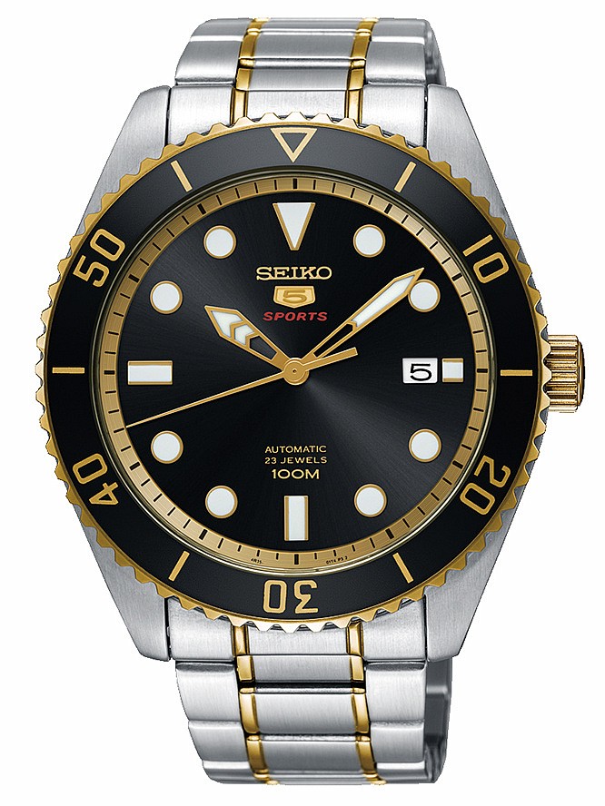 Velmi univerzální hodinky Seiko SRPB94K1 jsou novinkou v modelové řadě Seiko 5. Již na první pohled zaujme bicolor úprava pouzdra a náramku, černý číselník s efektem centrálního brusu, zlacené ručky, plastické indexy a jednosměrně otočná luneta s potápěčskou stupnicí. Indexy a ručky jsou pokryty silně luminiscenční barvou Lumibrite. Číselník je kryt odolným Hardlexovým sklíčkem. Pohon hodinek je zajištěn mechanickým strojkem s automatickým nátahem 4R35. Hodinky kromě času, zobrazují také datum a jsou vodotěsné do 10 ATM.