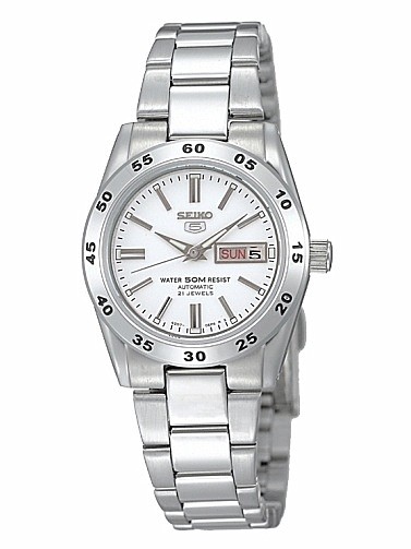 Elegantní dámské hodinky z řady Seiko 5 s typickým ukazatelem data a dne v týdnu a o velikosti 26 mm.