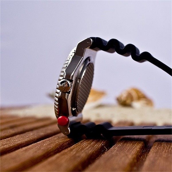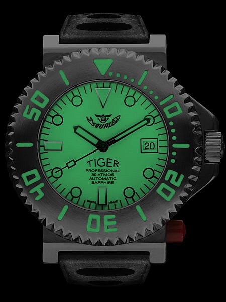 Squale Tiger 300M jsou novou verzí legendárního modelu Tiger, který byl poprvé představen v roce 1987. Díky svébytnému designu, výrazné ochraně šroubovací korunky na pozici třetí hodiny a červenému tlačítku pro aretaci obousměrně otočné lunety si hodinky vysloužily přezdívku “Baby Ploprof”. Modrý čísleník s výraznou oranžovou minutovou ručkou je kryt safírovým sklem s vnitřní antireflexní vrstvou. Indexy na ručně broušené lunetě jsou vyplněny luminiscenčním nátěrem. Pohon je zajištěn spolehlivým švýcarským strojkem ETA 2892-2 s funkcí zobrazení času a data. Hodinky jsou vodotěsné do 30 ATM.