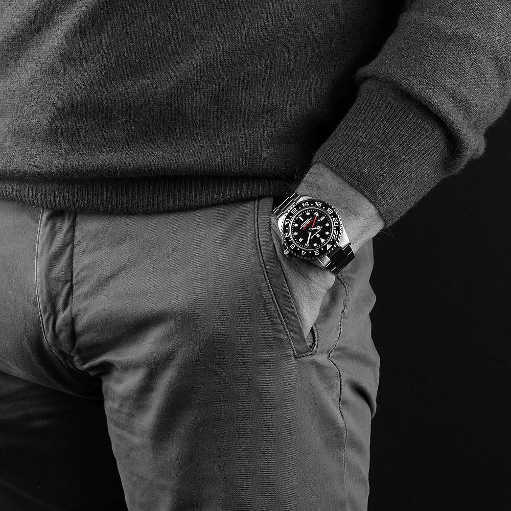 Cestovatelská klasika v novém, dospělejším provedení. Ocean 42 GMT Nova nabízí sledování druhé časové zóny díky švýcarskému strojku Sellita SW330-2 Elaboré a keramické lunetě. Hlavním tahákem edice Nova je absence zvětšovací lupy na datu, což dodává hodinkám symetrický a čistý vzhled. Poprvé v této řadě najdete také safírový průhled na strojek. Robustní 42 mm pouzdro doplňuje aktualizovaný ocelový tah se zúžením 22/18 mm a novou sponou, ta je vybavena systémem mikroregulace délky pomocí tlačitka na vnitřní straně spony.