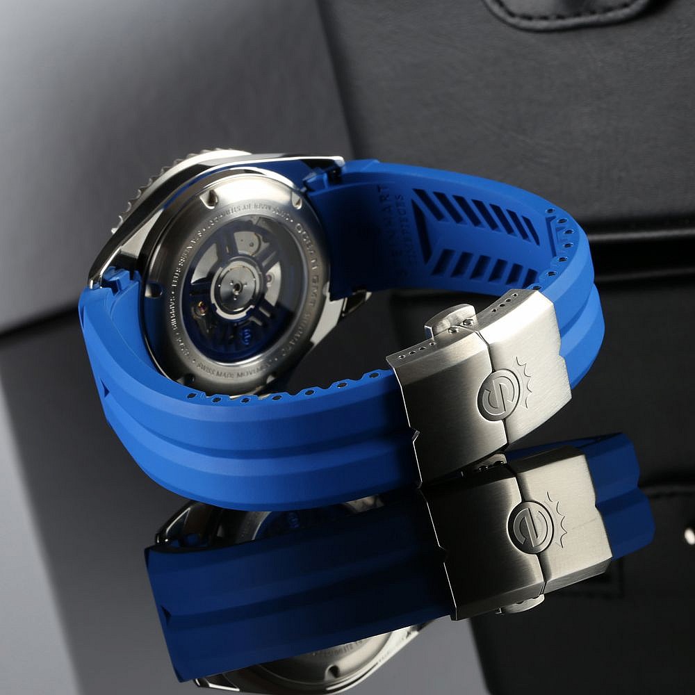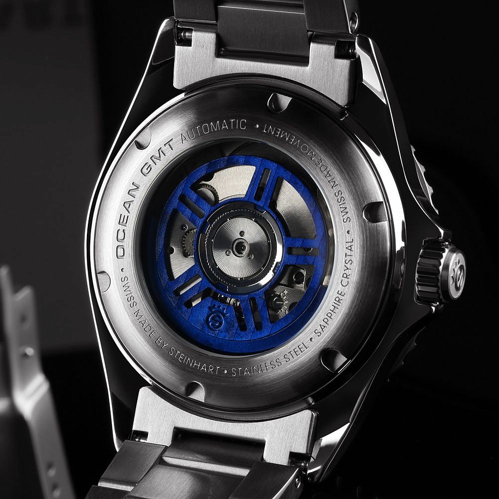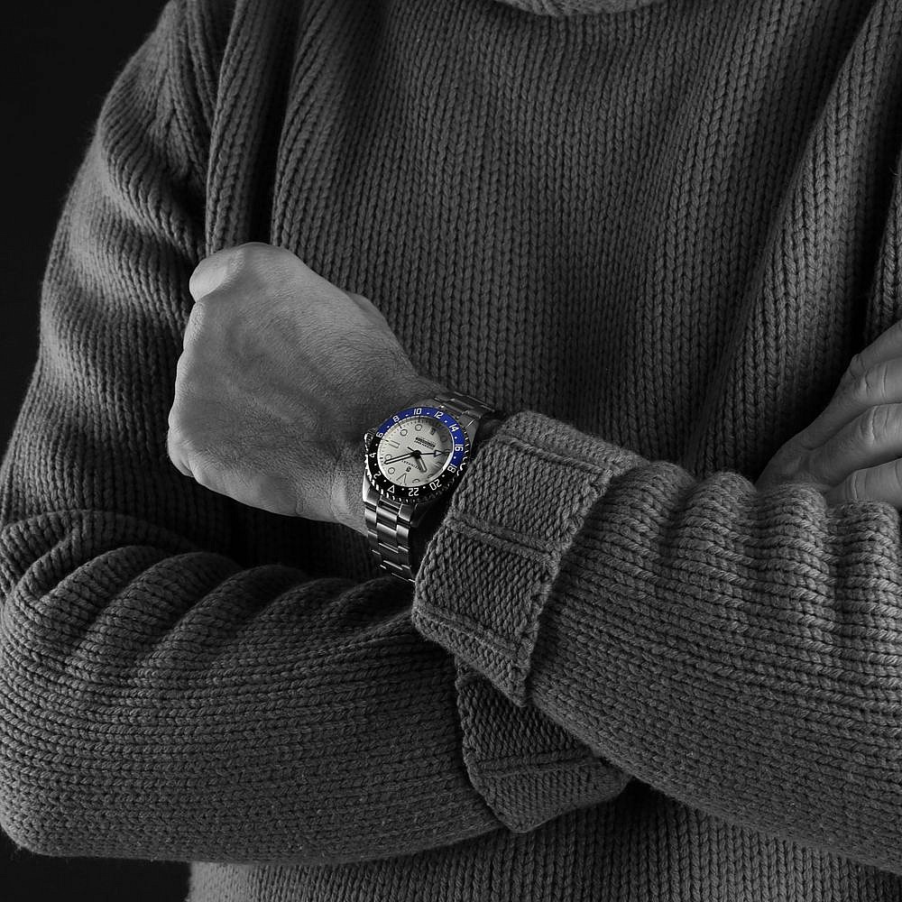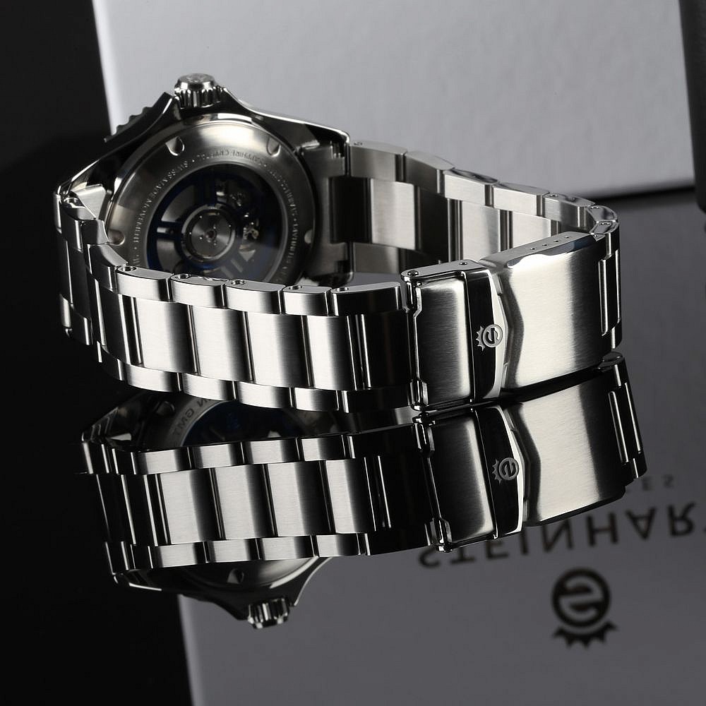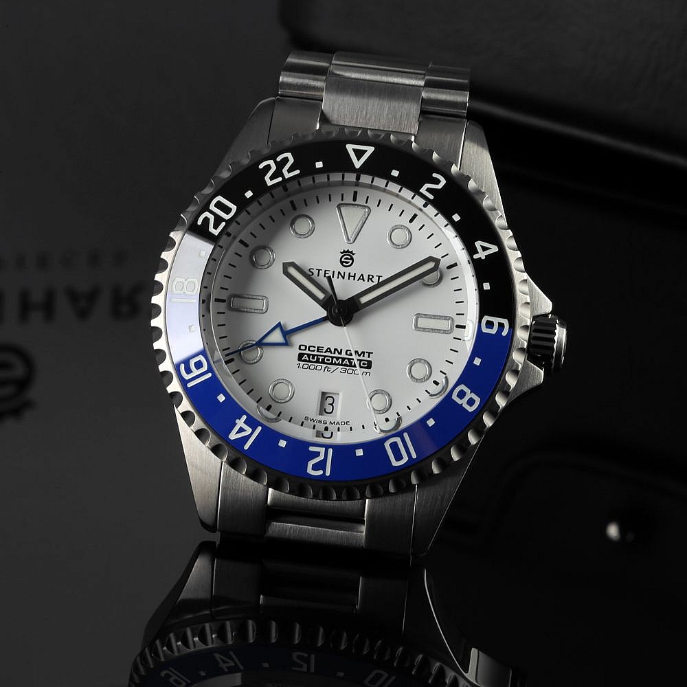 Limitovaná edice oblíbených potápek Ocean GMT od Steinhartu s bílým číselníkem. 200 kusů celosvětově, dva náhradní gumové řemeny jsou součástí balení.