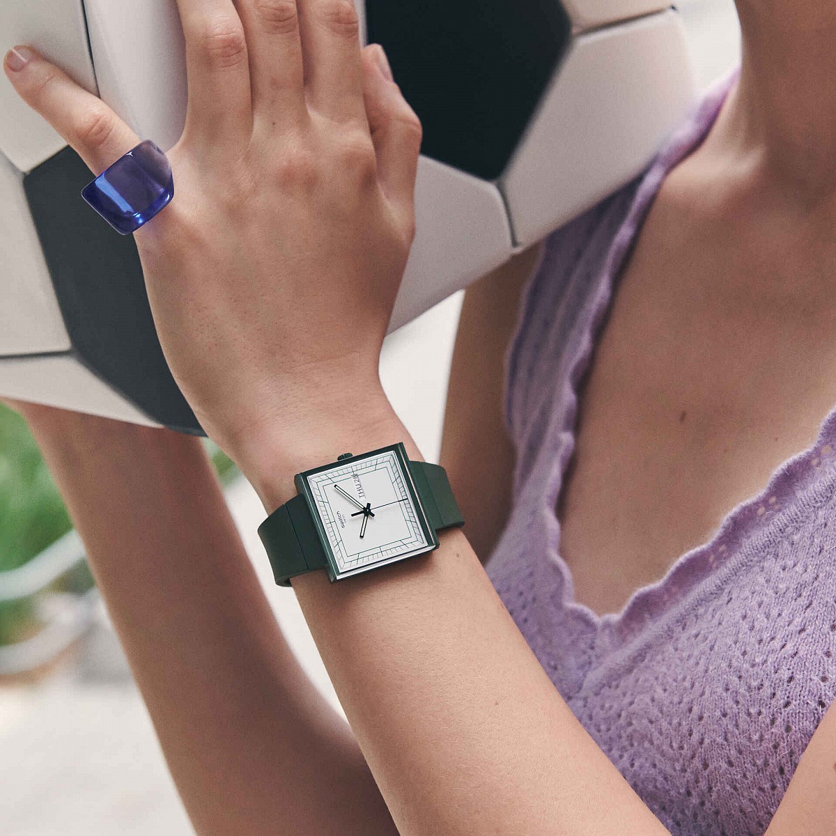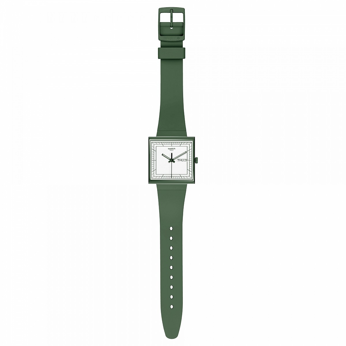 Univerzální hodinky s biokeramickým pouzdrem a nápaditým retro designem. BIOkeramické materiály jsou použity na pouzdro, sklíčko a řemínek. Sklíčko díky čtvercovému designu sahá až do stran a vzniká tím nový průhled na indexy a samotný číselník. Na dýnku hodinek je vytištěná podobizna hodinek Swatch, které inspirovaly design nových čtvercových Swatchek.