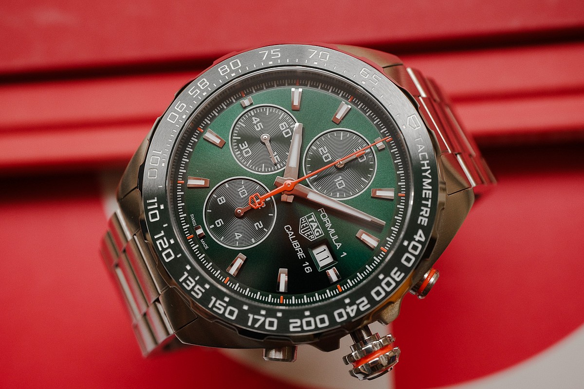 Sportovní charakter hodinek podtrhují dynamické oranžové detaily (sekundová ručka, indexy, tlačítko a korunka), které na zeleném podkladu perfektně vyniknou. Vše rámuje pevná tachymetrická luneta ze zelené keramiky, která je prakticky nepoškrábatelná a barevně sjednocuje celý design.