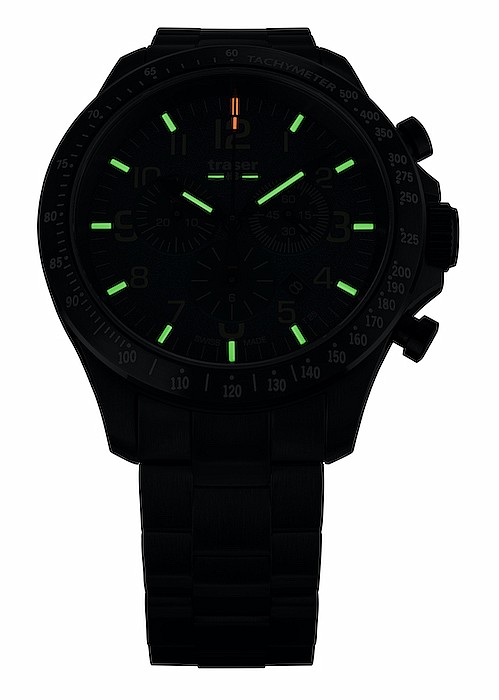 Traser Officer Pro Chronograph Blue jsou univerzální outdoorové hodinky s funkcí stopek. Pouzdro z ušlechtilé oceli s černou PVD úpravou o průměru 46 mm a výšce 13,7 mm má lunetu tachymetrickou stupnicí. Díky rozměrům se jedná o poměrně velké hodinky. Číselník je kryt odolným safírovým sklíčkem s antireflexní úpravou. Tritiové indexy a ručky svítí zelenou barvou, kromě indexu na 12 hodině, který svítí oranžově. Bezchybný chod je zajištěn švýcarským quartzovým strojkem Ronda s funkcí stopek, zobrazení času a data. Vodotěsnost hodinek je 10 ATM.