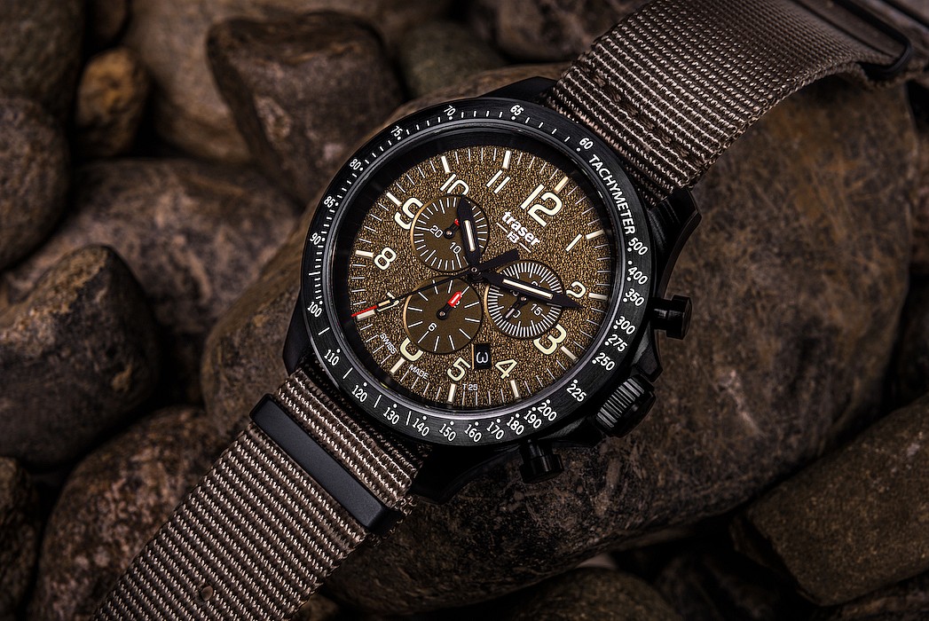 Traser Officer Pro Chronograph Khaki jsou univerzální outdoorové hodinky s funkcí stopek. Pouzdro z ušlechtilé oceli s černou PVD úpravou o průměru 46 mm a výšce 13,7 mm má lunetu tachymetrickou stupnicí. Díky rozměrům se jedná o poměrně velké hodinky. Číselník je kryt odolným safírovým sklíčkem s antireflexní úpravou. Tritiové indexy a ručky svítí zelenou barvou, kromě indexu na 12 hodině, který svítí oranžově. Bezchybný chod je zajištěn švýcarským quartzovým strojkem Ronda s funkcí stopek, zobrazení času a data. Vodotěsnost hodinek je 10 ATM.