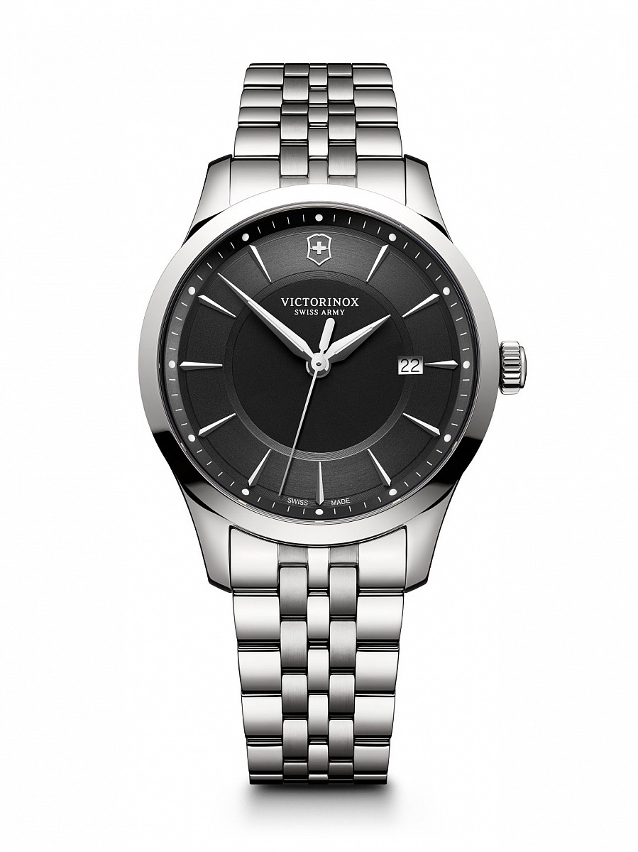 Victorinox Alliance jsou kvalitní švýcarské hodinky na kovovém náramku. Černý číselník se zlacenými ručkami s luminiscencí je kryt safírovým sklem s antireflexní vrstvou, zaručující perfektní čitelnost. O bezchybný chod se stará švýcarský quartzový strojek Ronda 715 s funkcí zobrazení času a data. Nerezové pouzdro má průměr 40 mm. Hodinky jsou vodotěsné do 10 ATM.