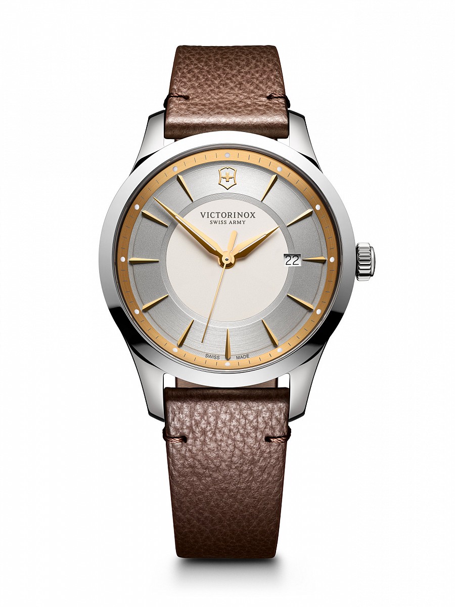 Victorinox Alliance jsou kvalitní švýcarské hodinky na koženém řemenu. Stříbrnýčíselník se zlacenými ručkami s luminiscencí je kryt safírovým sklem s antireflexní vrstvou, zaručující perfektní čitelnost. O bezchybný chod se stará švýcarský quartzový strojek Ronda 715 s funkcí zobrazení času a data. Nerezové pouzdro má průměr 40 mm. Hodinky jsou vodotěsné do 10 ATM.