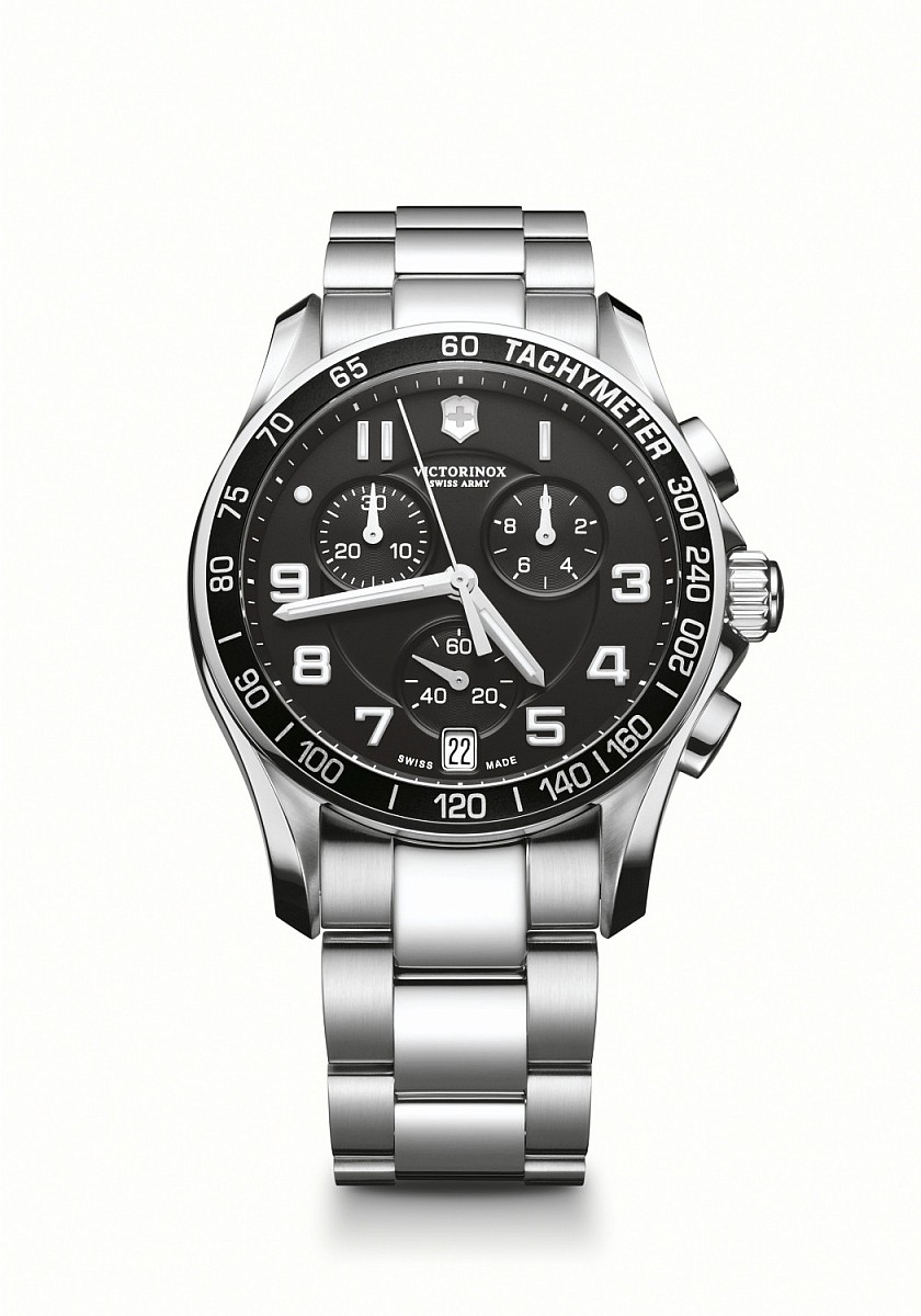 Victorinox Chrono Classic jsou švýcarské sportovně elegantní pánské hodinky na kovovém náramku. Nerezové pouzdro s leštěnými i broušenými plochami má průměr 41 mm a je osazeno lunetou s tachymetrickou stupnicí. Černý číselník se subciferníky chronografu je kryt safírovým sklem s trojitou antireflexní vrstvou, zaručující perfektní čitelnost. Ručky a indexy jsou luminiscenční. O pohon se stará švýcarský quartzový strojek ETA G10.212 s funkcí kalendáře a stopek, které měří s přesností na 1/10 s. Hodinky jsou vodotěsné do 10 ATM.