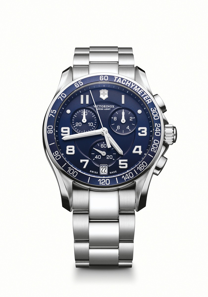 Victorinox Chrono Classic jsou švýcarské sportovně elegantní pánské hodinky na kovovém náramku. Nerezové pouzdro s leštěnými i broušenými plochami má průměr 41 mm a je osazeno lunetou s tachymetrickou stupnicí. Modrý číselník se subciferníky chronografu je kryt safírovým sklem s trojitou antireflexní vrstvou, zaručující perfektní čitelnost. Ručky a indexy jsou luminiscenční. O pohon se stará švýcarský quartzový strojek ETA G10.212 s funkcí kalendáře a stopek, které měří s přesností na 1/10 s. Hodinky jsou vodotěsné do 10 ATM.